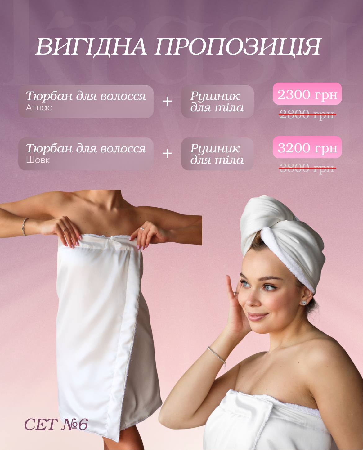 Красавки, зараз маєте унікальну можливість придбати комплект (тюрбан для сушки волосся + рушник для тіла) зі знижкою -20% по супер вигідній ціні: