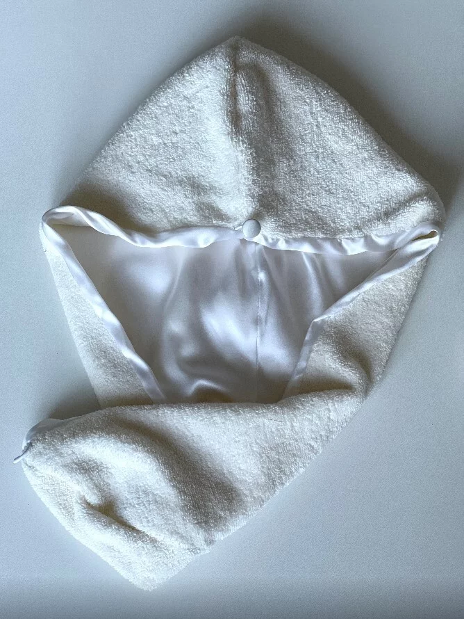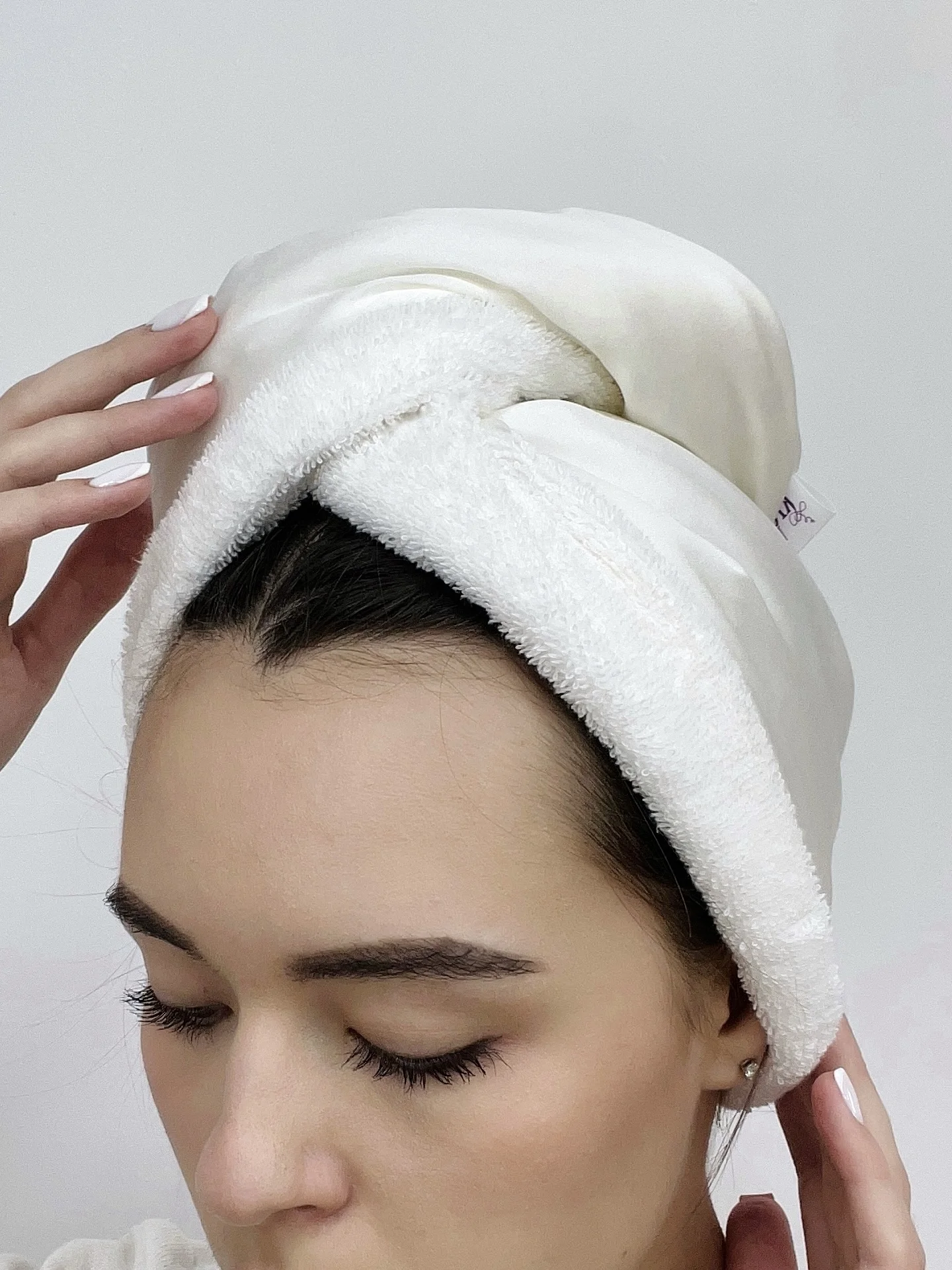 Перша сторона потрібна, щоб поглинути зайву вологу з волосся  (1-3 хвилинки достатньо).  Потім закручуємо з шовкової сторони. Волосся ще трохи підсохне +відполірується за рахунок гладкої структури тюрбана і стане більш шовковистим, блискучим та гладеньким. До того ж, такий тюрбан легенький, не тягне волосся, як звичайний рушник.